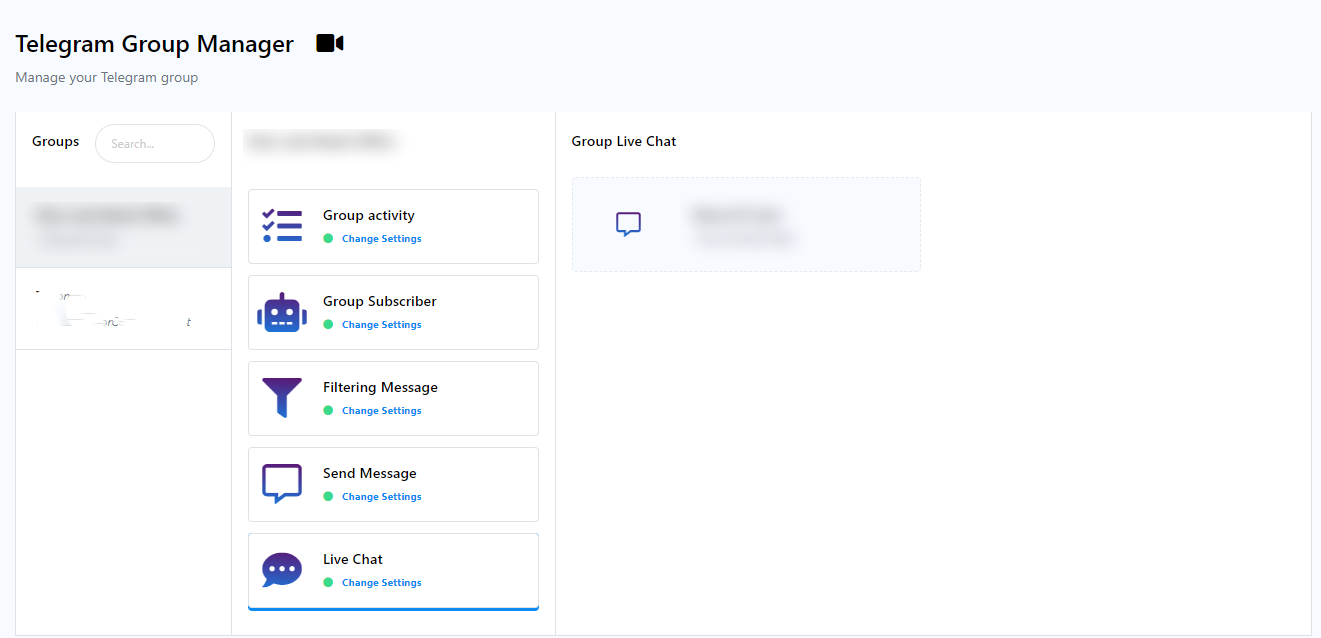 - To initiate the process, navigate to the `Telegram Group Manager` and select a bot from the group`s Live Chat window. Click on the chosen bot to proceed.